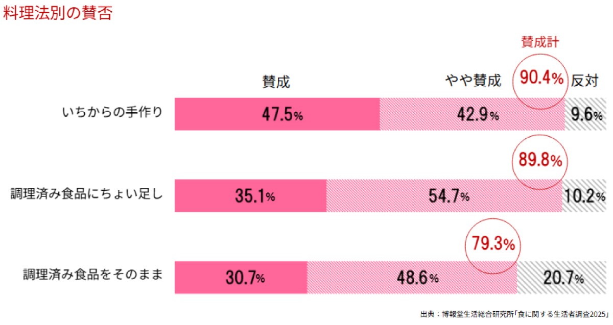 これをみると、「いちからの手作り」と「調理済み食品にちょい足し」だと賛成計(賛成+やや賛成)のスコアはほとんど変わらないんですよね。「調理済み食品にちょい足し」もこれからの時代の「手作り」と言っていいんじゃないかと思うんです。