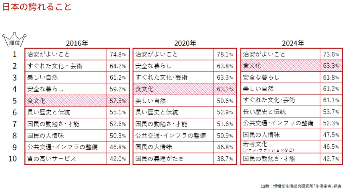 生活総研の調査で「日本の誇れることは何ですか」という質問をしているのですが、2013年に和食がユネスコの無形文化遺産に登録された後に選択肢として追加した「食文化」が2016年には5位、2020年には4位、2024年には2位と順位を上げ続けています。