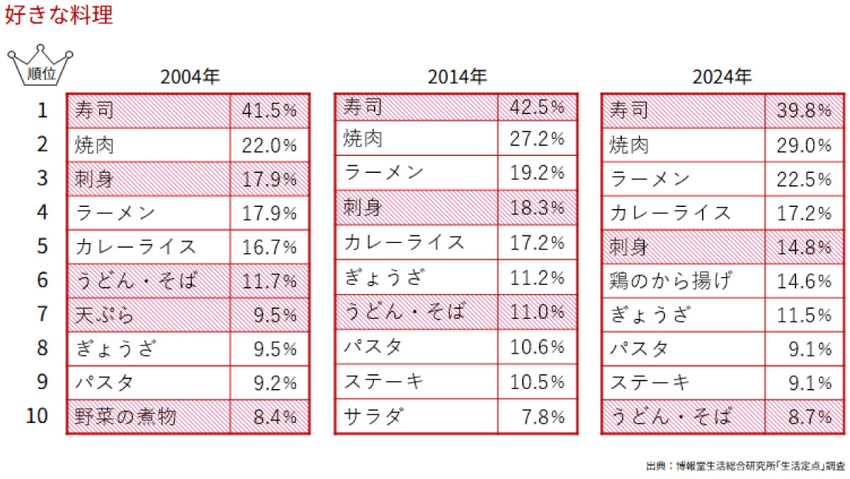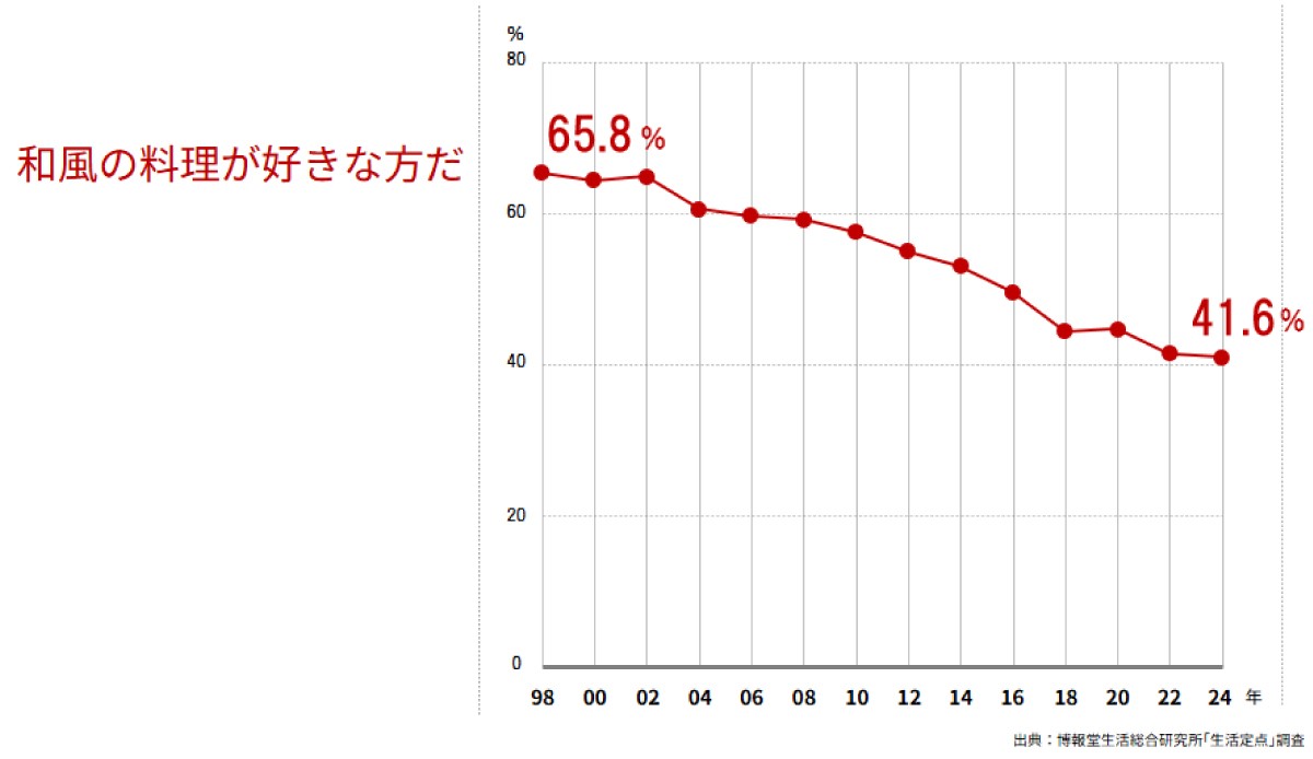 これはとても誇らしいことであると同時に、気になるデータも。「和風の料理が好きな方だ」という人が年々減って、直近の2024年では41. 6%にまで落ち込んでしまっているんです。「好きな料理」のランキングでは、「寿司」はトップを維持するものの、「刺身」「うどん・そば」は順位を落とし、「天ぷら」「野菜の煮物」はトップ10圏外になるなど、和食のメニューが順位もスコアも低くなっています。和食は日本の誇りであるのに、和風の人気が落ちているのはなぜだと思われますか?