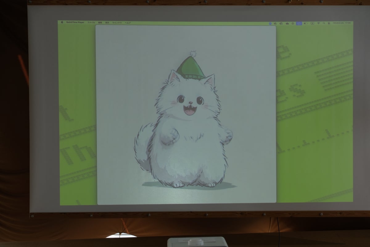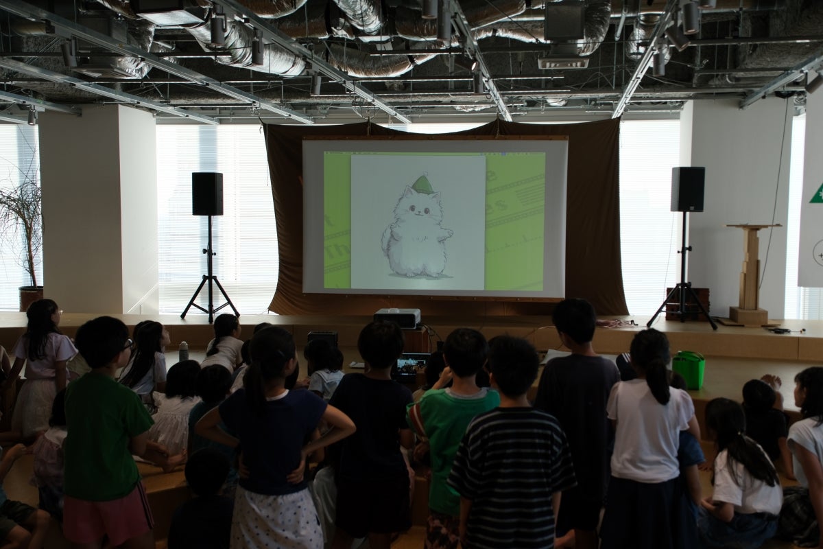 CREATIVE KIDS CAMPの公式キャラクターを作るべく、子どもたちが名前や性格などキャラクター像を考えるプログラムもありました。様々なアイデアを講師とともに集約し、キャラクターの詳細な設定が決まったところでAIに生成させると、全員で考えた公式キャラクター「クリッピー」が誕生。音声と組み合わせ、クリッピーが実際に喋る様子に子どもたちは興味津々でした。