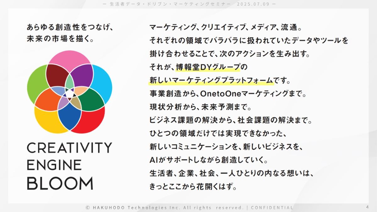 「CREATIVITY ENGINE BLOOM」とは、博報堂DYグループが開発した、新しい統合マーケティングプラットフォームのことで、当社グループのデータ基盤である「生活者 DATA PLATFORM」と、プラットフォーマーが持つ膨大なデータや、クライアント企業が持つ多様なデータをつなぎ合わせ、「Human-Centered AI機能」を介して、5つのモジュールに落とし込んでいく仕組みとなっています。