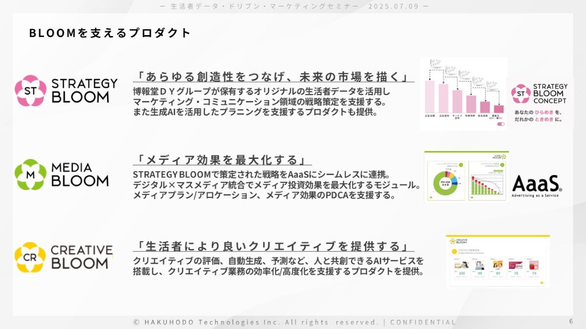 <STRATEGY BLOOM>は、マーケティング戦略の策定を支援するモジュールです。生活者データとクライアント企業のデータを統合し、AI技術を用いることで、市場構造の可視化やターゲット設定、KPI策定などの業務を効率化します。こちらについては、セミナーの後編でも詳しく紹介させていただきます。