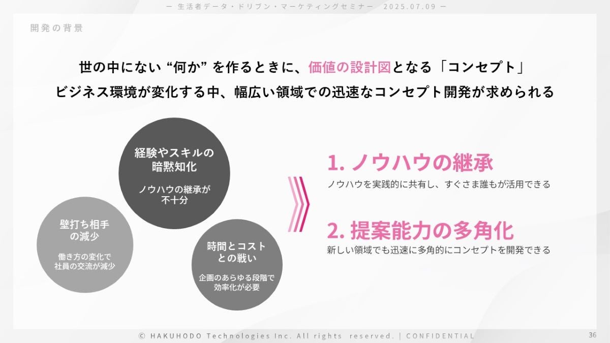 ただ、クリエイティブワークの現場では、経験やスキルが個人やチーム内にとどまってしまいノウハウが継承されづらいという現状もあり、とくに難易度が高いコンセプト開発においては、大きな課題となっていました。