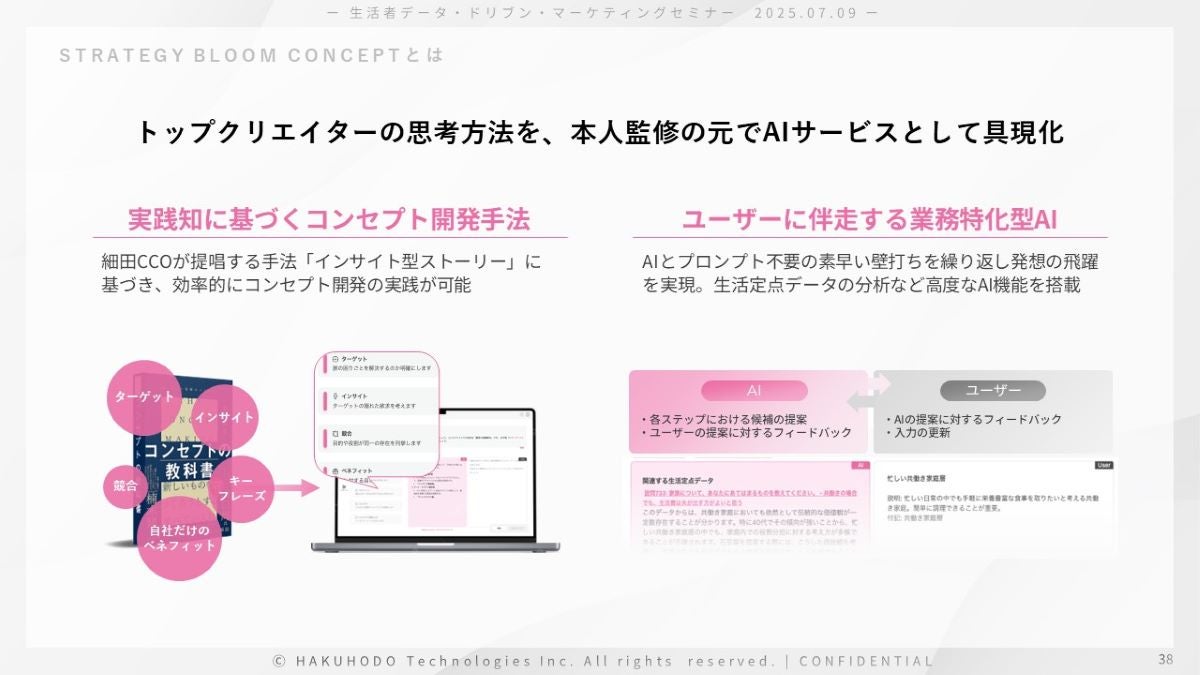 このプロダクトは、コンセプト開発の経験が豊富なトップクリエイターである、TBWA/HAKUHODO チーフ・クリエイティブ・オフィサーの細田高広の思考法を、本人監修のもと、AIサービスとして具現化したものとなっています。