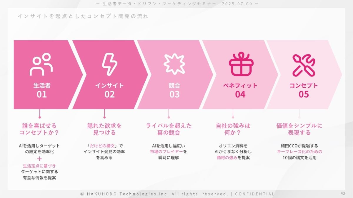 具体的には、細田が提唱するコンセプト開発手法「インサイト型ストーリー」をプロダクトで再現。7つのステップを順に進めていくだけでコンセプト開発が完了するようになっています。中には難しく感じるステップもあるかもしれませんが、ステップごとに細田直伝のコンセプト開発のノウハウを記載していたり、プロンプト不要で素早い壁打ちができる業務特化型AIを搭載していたりと、初めての方でも迷わずコンセプト開発を進めていただけるようになっているのが特長です。