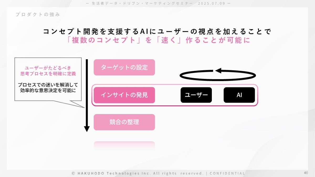 コンセプト開発を支援するAIというと、「コンセプトを提案してくれるAI 」を一番に思い浮かべるかもしれませんが、本当に重要なのは、コンセプトではありません。コンセプトに辿り着くまでのストーリーこそが重要で、そこをAIで支援するというのが、私たちのプロダクトのポイントだと考えています。