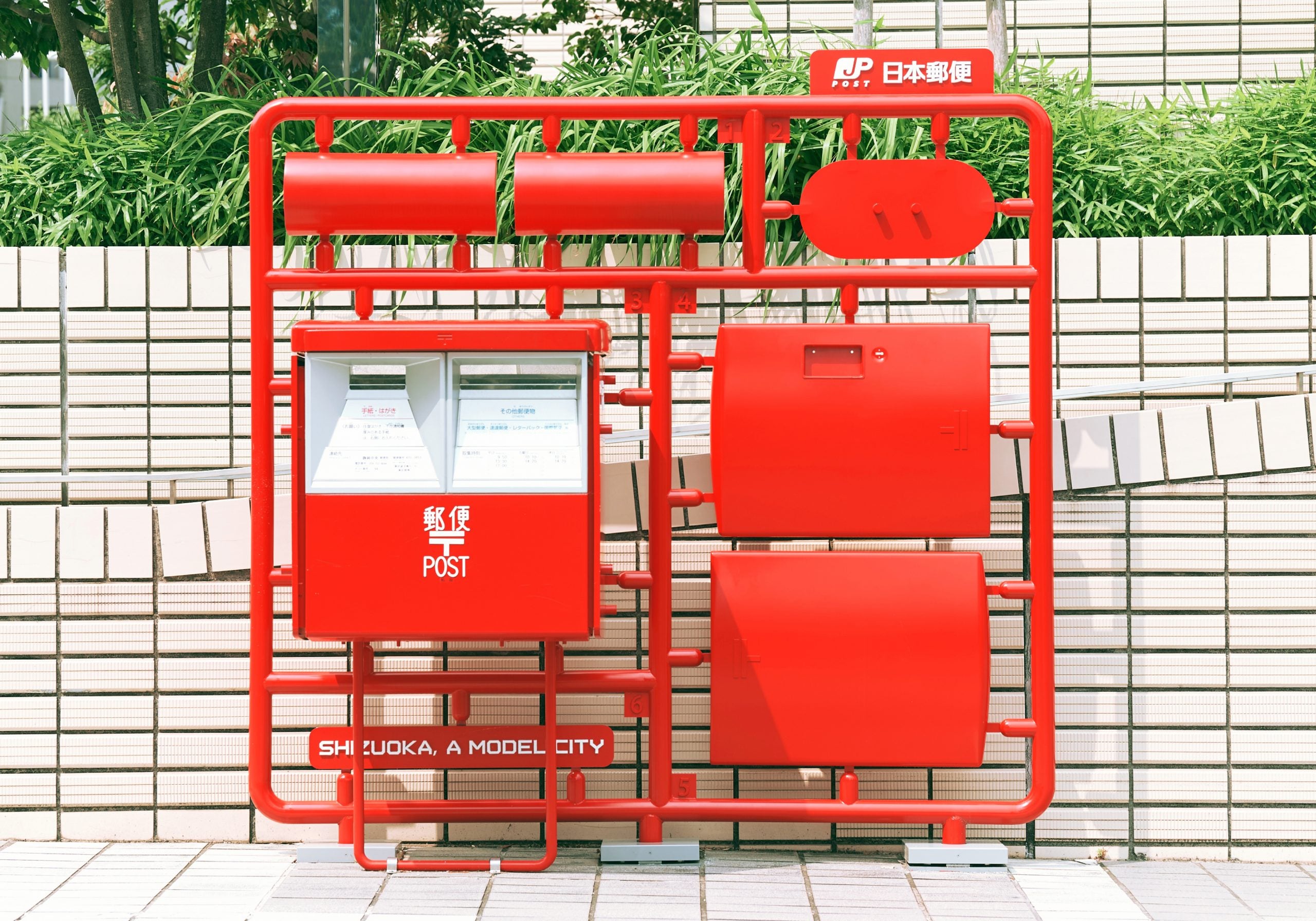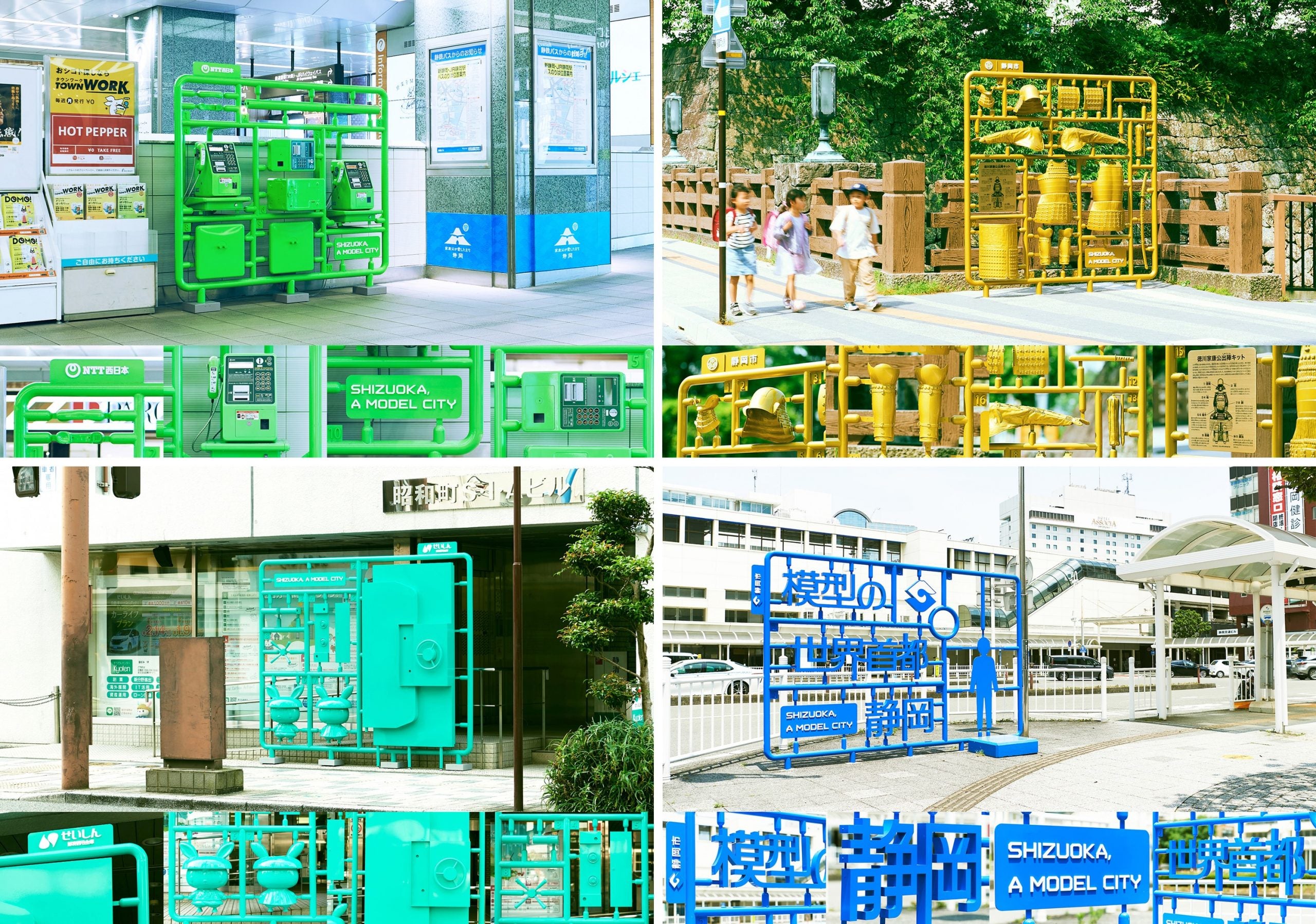 考えたのは静岡市の持っている伝統産業であるプラモデルに着目し、街そのものの風景を作り、観光客を呼び込むこと。すでに街に存在していた郵便ポストや公衆電話、店舗の看板などをプラモデルの組み立て前のような状態に分解して設置。本物の製品をお借りして、工場でバラバラにしてからプラモデルっぽさを出すためにあえて部品を加えたり、各パーツの配列などもいくつも検証。実際にハガキも出せるし、電話もかけられるなど、可能な限り機能面は残すことにした。