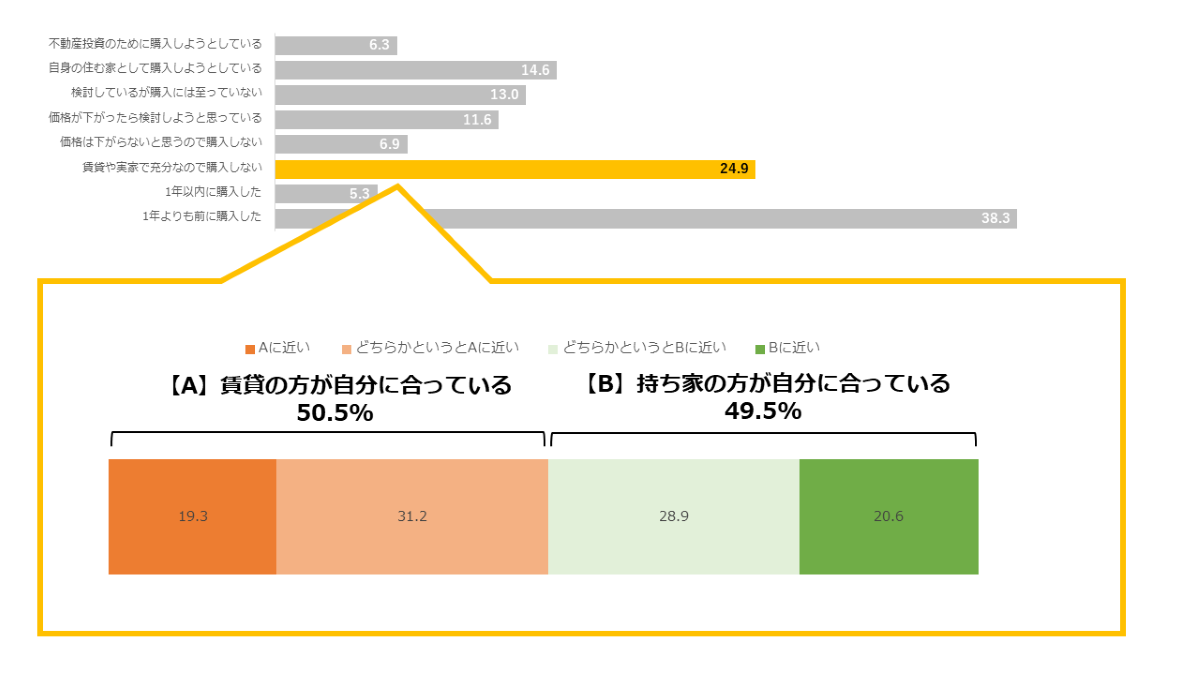 東京オリンピック前後から続く住宅価格の高騰は、多くの生活者にとって「今住宅を買うのは損」という感覚を定着させました。今回の調査結果を見ても、未だにその意識は強く残っていることが伺えます。「価格が下がれば買いたい」「価格は下がらない」という検討層以上に、「賃貸や実家で充分」と、初めから住宅購入を選択肢に入れていない層が全体の1/4(24.9%)を占めています。