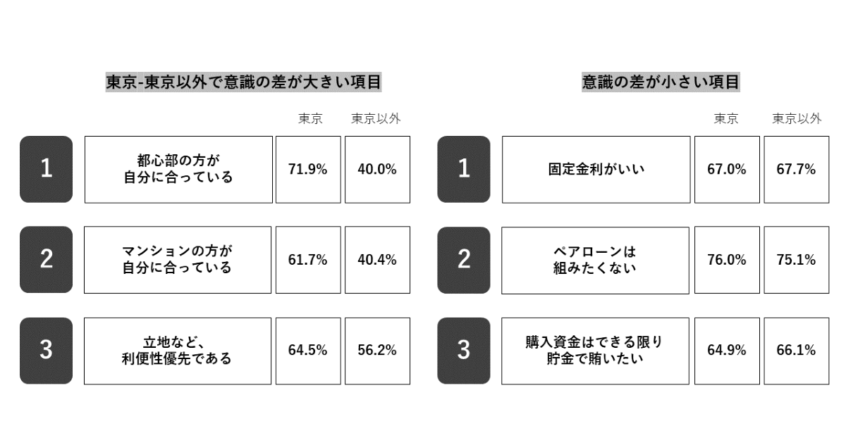意識の差として大きいのは地域差として推測しやすい「都心・マンション・利便性」などの項目ですが、反対に地域差がないのがローンに対する意識。ペアローンなど、地域差が出やすそうな意識においても、同様の傾向が出ました。