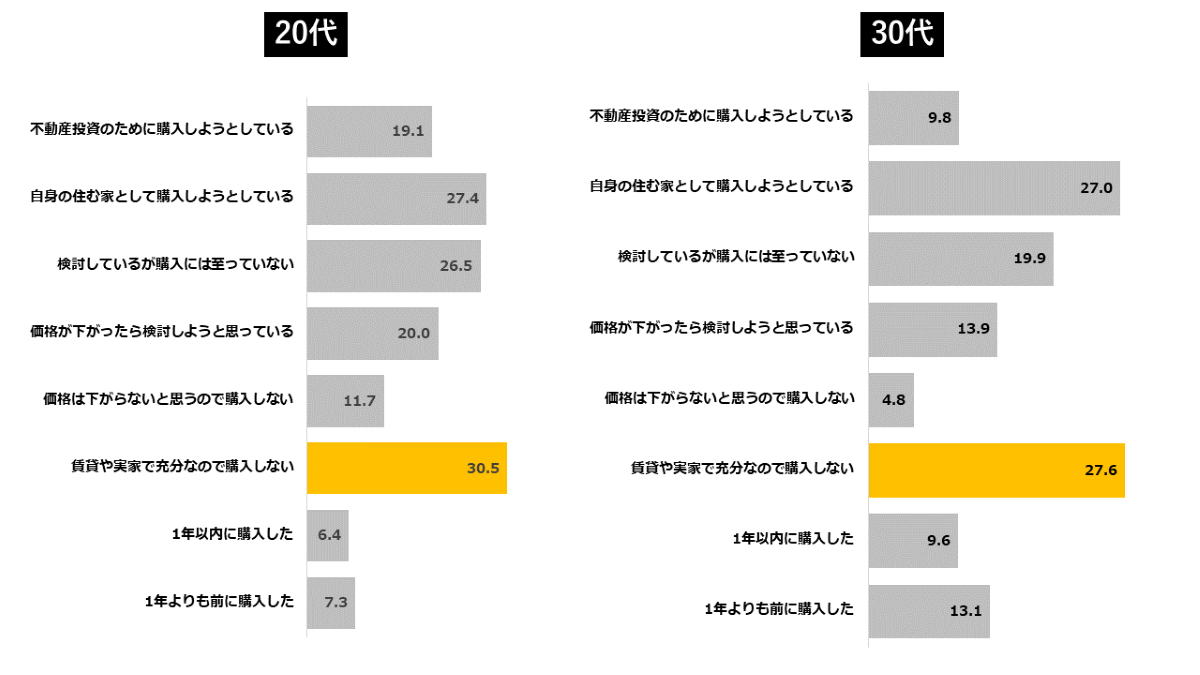 「賃貸や実家で充分」という意識は20代/30代の若年層に多いかと思いきや、世代別で見てみると、年齢に関わらず一定程度確立された意識であるということが分かります。