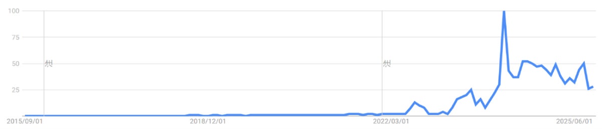 実際に、脱出ゲームや謎解き系など、いわゆる没入型体験がどの程度浸透してきているのか調べてみようと思い、「イマーシブ」の検索数を見てみたところ、昨年あたりに大きく検索数が上昇し、その後もある程度高い水準で検索数をキープしていることから、トレンドとなったあとも一定の関心を持たれている領域であることがわかります。