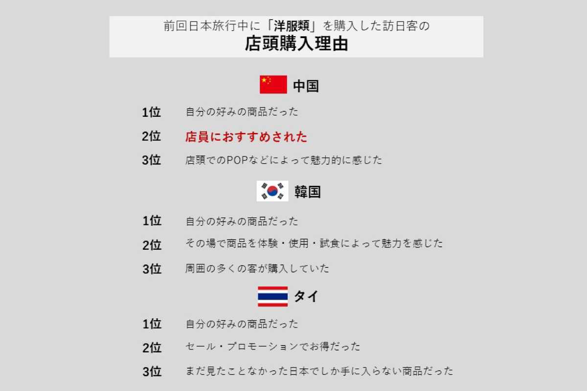 また、洋服類の店頭購入理由を見ると、中国のみで「店員におすすめされた」がTOP3に入り、店員のコーディネート提案や推薦を重視する傾向が見られます。これは、現地のアドバイスや日本での最新トレンドを購入の基準とする動きと考えられます。