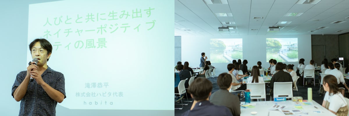 続いて、協働によるグリーンインフラ地域実装を軸とし、ボトムアップ・アプローチを通した環境共生型の地域づくり・まちづくりを推進する株式会社ハビタ 代表取締役の滝澤恭平氏が、「人びとと共に生み出すネイチャーポジティブシティの風景」をテーマに講義。