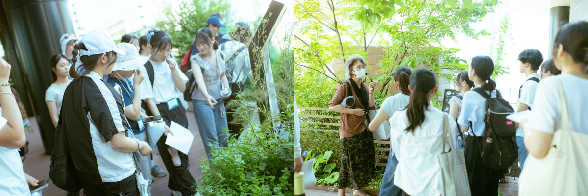 東京ポートシティ竹芝の「竹芝新八景」では、スキップテラスを中心に展開している生物多様性を守る取り組みとして「空・蜂・水田・菜園・香・水・島・雨」の8つの景をつくり、訪れる方に生物多様性について知ってもらうため多様な活動をされています。東急不動産株式会社 簗瀬理恵子氏、株式会社かたばみ 水野さえ子氏に8つの景をご案内いただき、ビルのテラスにつくられた水田や菜園、ハーブガーデン、そして雨水を一時的に貯留した後ろ過して地中に還すレインガーデンなど、自然豊かな環境を見学しながら、自然の価値を体感。水野氏からは「竹芝新八景では、本来の関東平野に近い植生を極力再現している。竹芝エリア全体でバランスをとりながら生物多様性を促進することに力を入れており、人と自然の共生を目指している」とお話がありました。