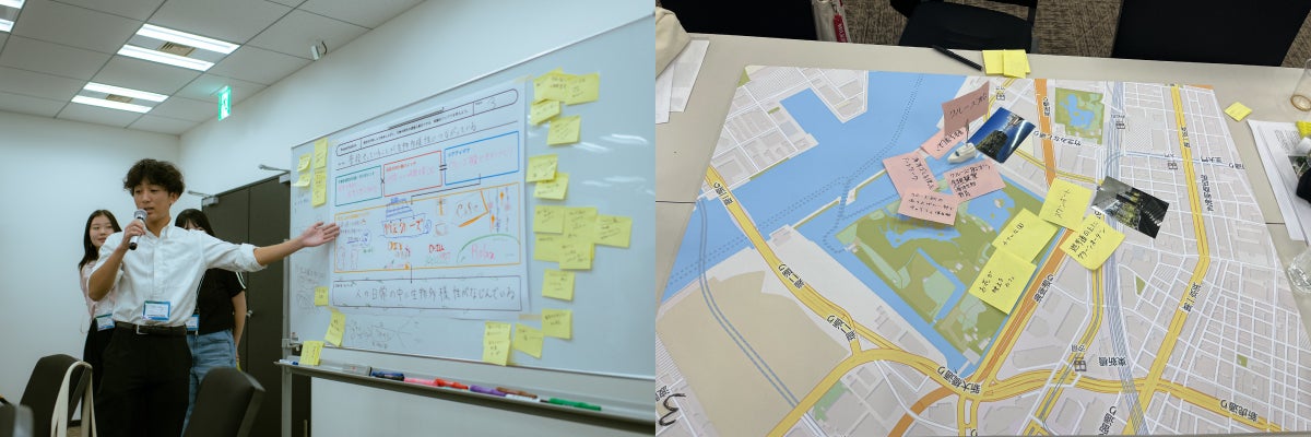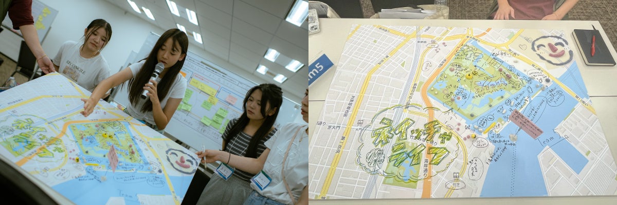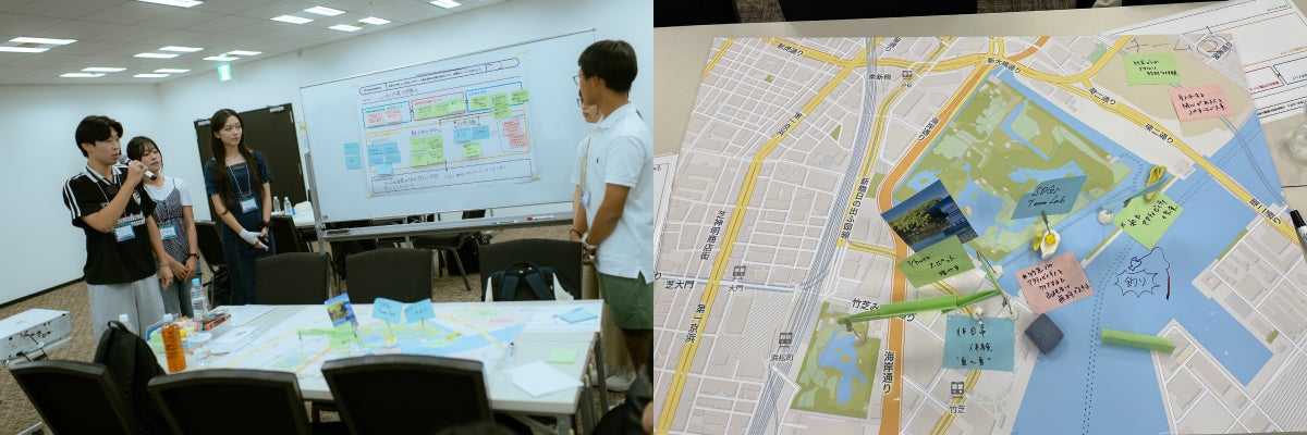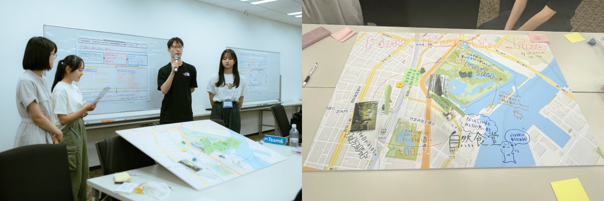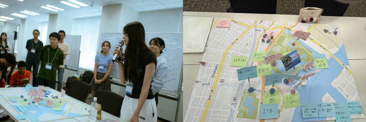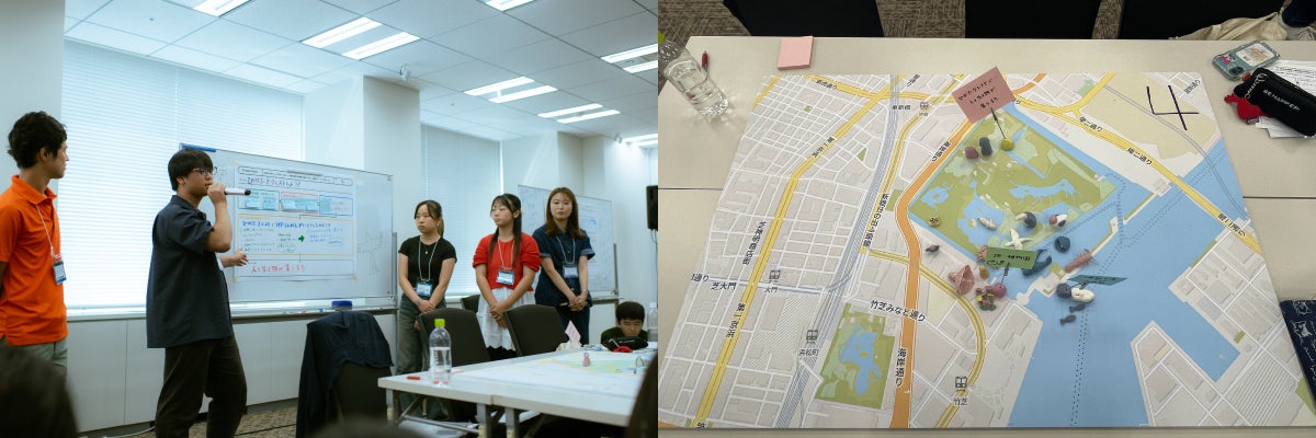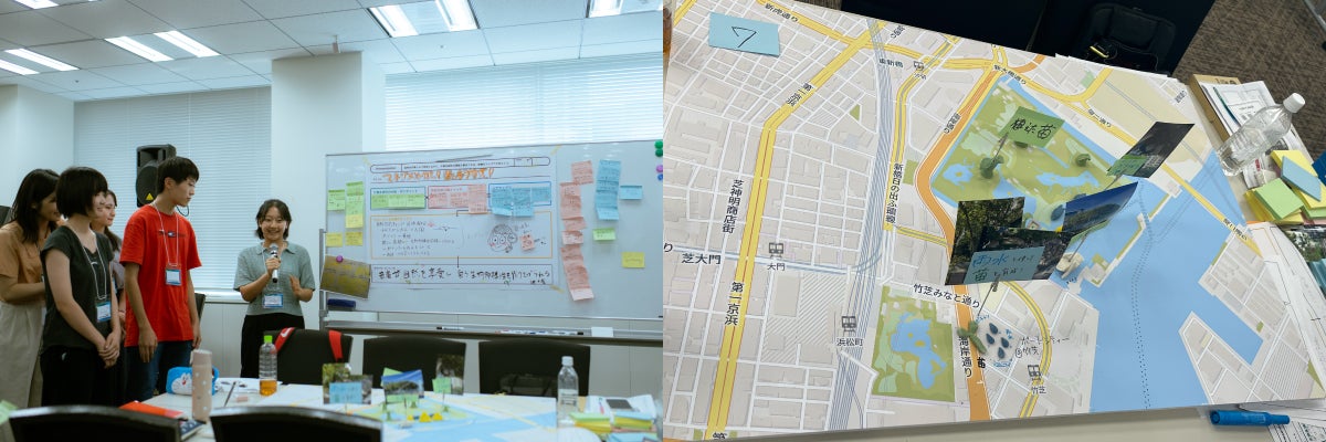 Day3はいよいよ、各チームでアイデアを練り上げ、プレゼンテーションを行います。まず、チーム内で各人が考えてきた企画のコアアイデアについて共有しました。それを踏まえてチームとして発表するポイントを整理し、実際に竹芝地域に落としこんだ「生物多様性の課題解決につながる、高校生が参加したくなるようなまちづくり」のアイデアを話し合います。最後に各チームで発表内容とランドスケープデザインをまとめたら、プレゼンテーションです。ランドスケープデザインは、地図上に写真やふせん、粘土(環境に配慮した自然に還る粘土)などを使って立体的に仕上げました。