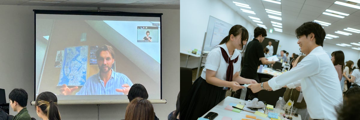 プレゼンテーションと講評のあとは、コペンハーゲンを拠点とする都市デザインのコンサルティング会社Gehl Architects(ゲールアーキテクツ)のLeon Legeland氏からスペシャルインプット。Gehlが世界中で実践している人と地球のための都市づくりの事例を紹介しながら、「なぜ都市づくりにおいて生物多様性を考えないといけないのか?それは、都市は生物多様性を脅かす可能性がある一方で、その未来を握る鍵でもあるため。2050年までに、世界の人口の70%が都市に住むようになると考えられており、これからは都市への新しいアプローチが必要。東京は、便利な公共交通機関など良い面をもつ都市である一方、課題もある。より良い未来のための都市計画・デザインには、みなさんのアイデアと想像力が重要」と語りました。