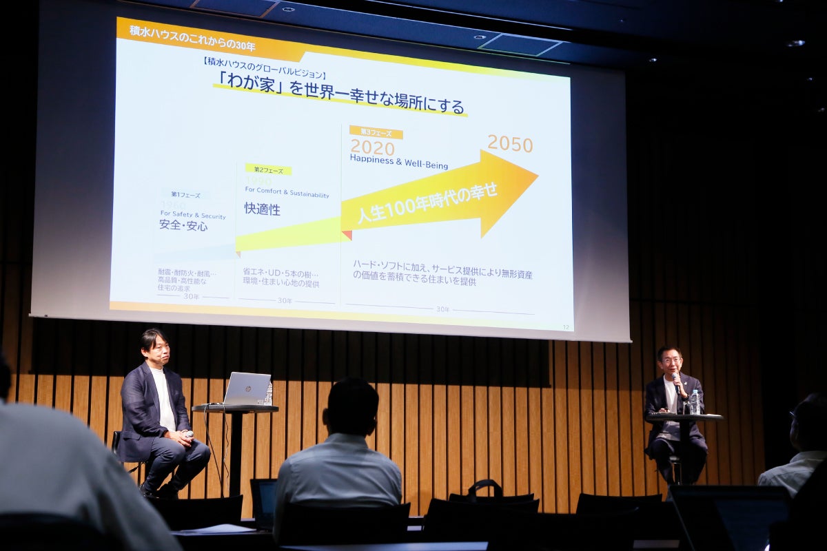 青木は、「これからの『生活のデジタル化』の時代は、暮らしを支える住宅、車、鉄道、流通などの企業がキープレイヤーになるだろう。そうした企業と一緒に新しい市場をつくる仕事をしたいと思っていたところで、吉田さんとの出会いがあった」と述べ、積水ハウスの吉田氏にバトンタッチした。