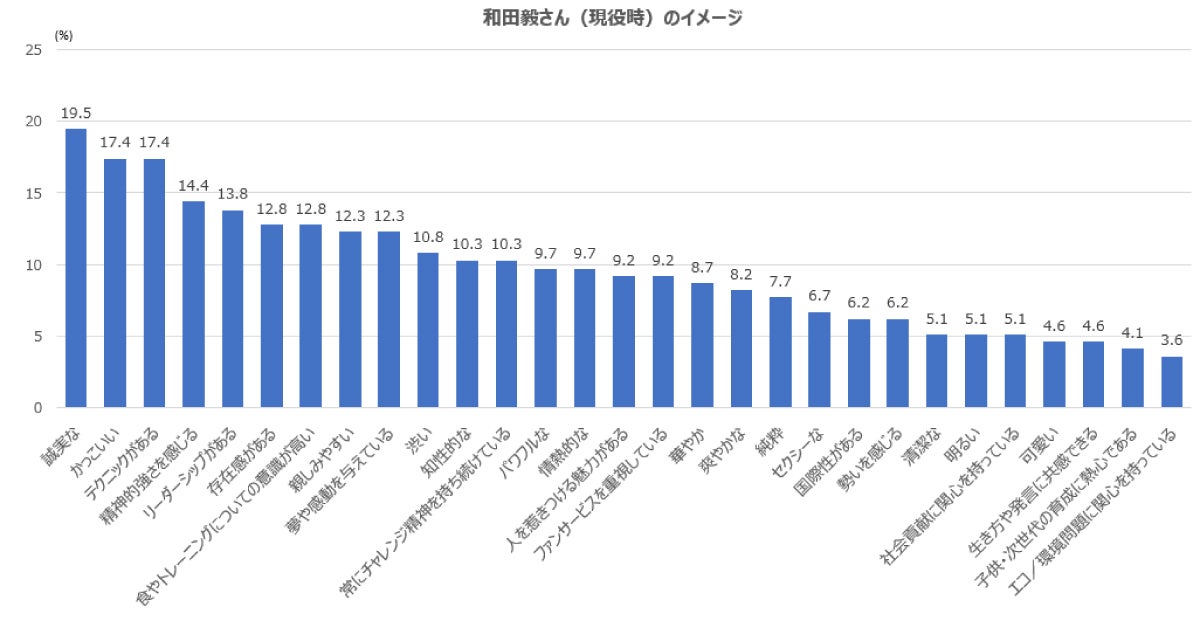 -博報堂では2008年からアスリートイメージ評価調査という調査を行なっています。和田さんの現役時代、2023年10月のデータを見ると、「誠実な」「かっこいい」「テクニックがある」という項目が高くなっていますね。