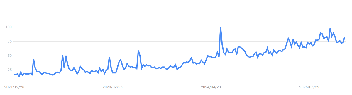 そして、そんな慌ただしい時期に、よりにもよってスマホの調子が悪く、買替えを検討しています。そこでちょっと気になっているのが、いわゆるdumb phone(ダムフォン)。ご存知の方も多いかもしれませんが、少し説明させていただきますと、dumb phoneは “おばかケータイ”といった意。なぜおばか呼ばわりかというと、通話やメール、アラームといった基本的な機能のみのシンプルでロースペックな携帯電話だからです。下記検索数のグラフからも分かる通り、世界的には、2024年の春ごろから現在まで注目が増していることが分かります。