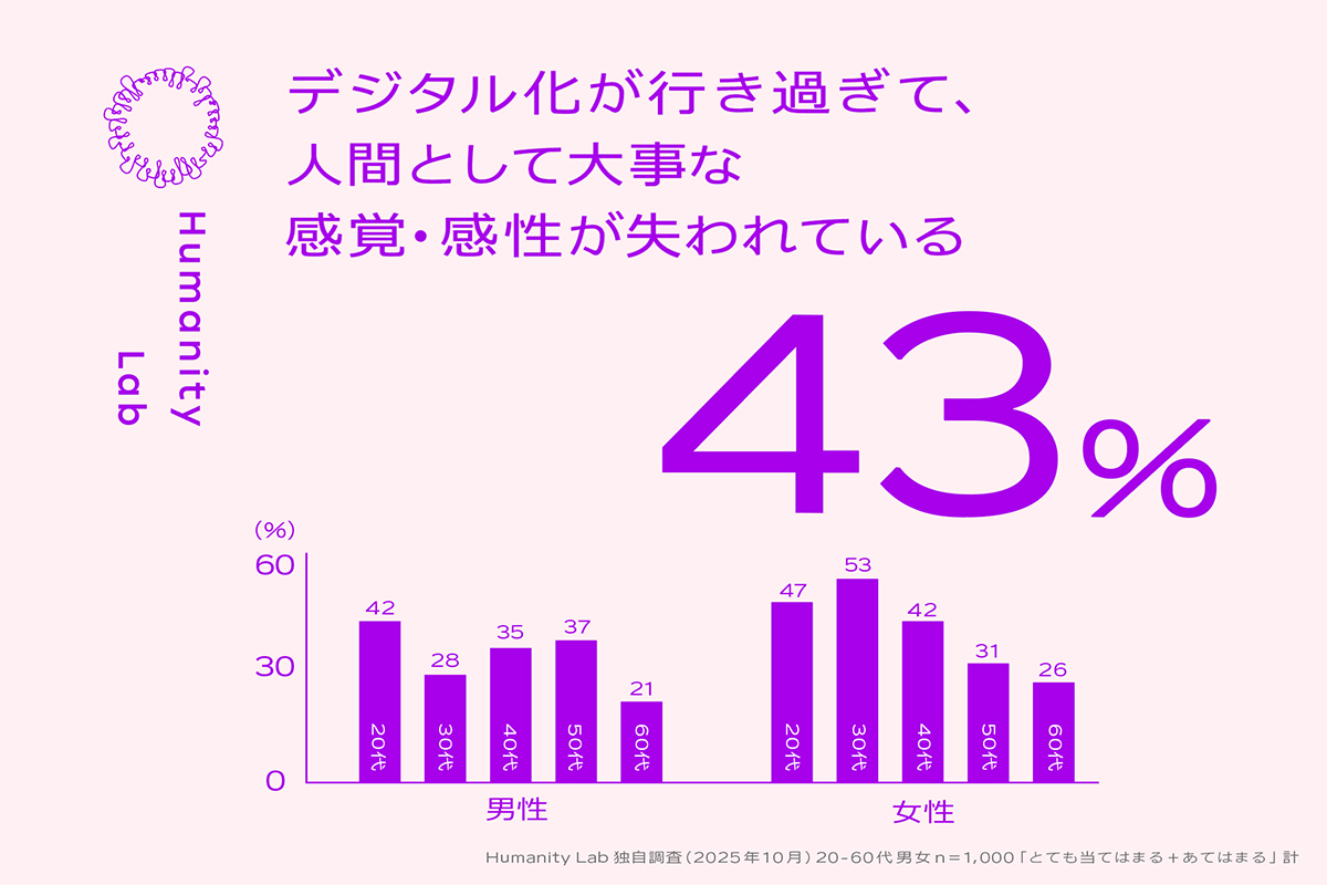 「デジタル化が行き過ぎて、人間として大事な感覚・感性が失われている」という項目において、20代-60代の方のうち43パーセントの人が「そう思う」と答えており、なかでも30代女性では半数以上の人がそう感じています。