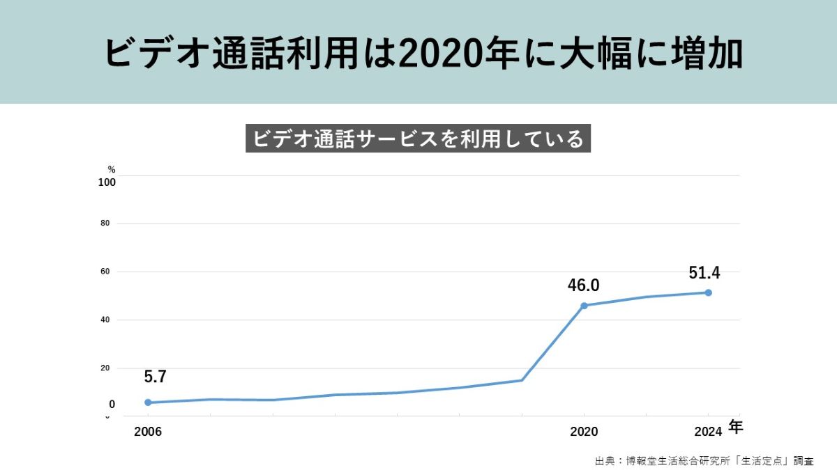 例えば、ビデオ通話サービスの利用率は2020年に大幅に増加し、その後も着実に上昇を続けています。