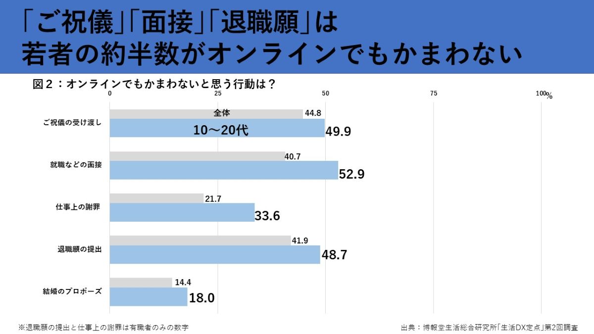 更には、以前では考えにくかった行動までオンライン化が受け入れられるようになっています。ご祝儀、面接、退職願いといった従来は対面が常識と考えられていた領域でも、若者の約半数はオンラインでも構わないと回答しています。