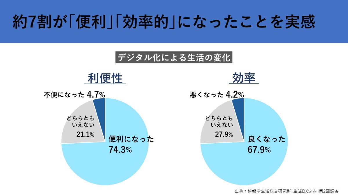 生活のデジタル化は、生活者に恩恵をもたらし、特に効率性や利便性の向上が実感されています。