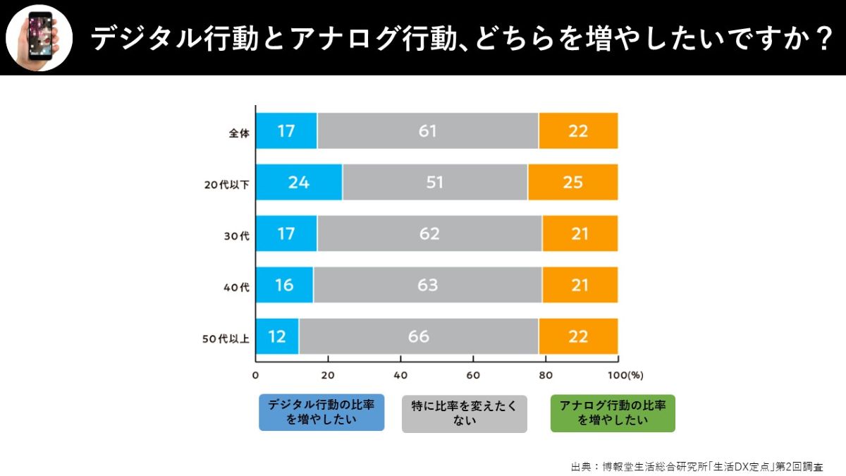 その一方で、生活者に今後のデジタル化意向を聞くと、生活者は自分の生活をデジタル化することにさほど積極的ではなく、むしろアナログの方を増やしてもいいのではないかと思い始めていることが分かります。
