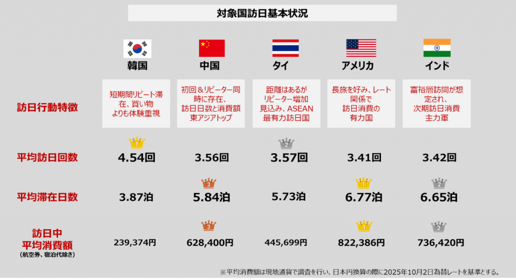 一方で、平均訪日回数を見ると、韓国は4.54回と最も多く、頻繁に日本を訪れるリピーター層の厚さが際立っています。これは、韓国人にとって日本が「一生に一度の観光地」ではなく、「日常を彩る延長線上のデスティネーション」になっていることを明確に示しています。