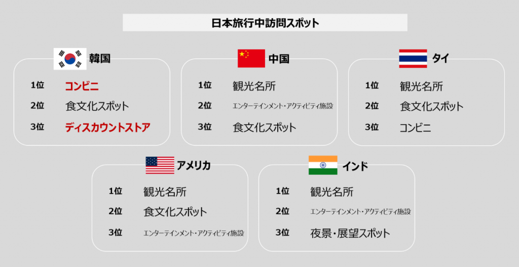 韓国以外の4か国の人々が必ず訪れる歴史的観光名所等に対し、韓国人旅行者が熱心に訪れるのは、現地の生活密着型スポットです。具体的には食文化スポットはもちろん、コンビニエンスストアやディスカウントストアへの訪問率が極めて高いのが特徴です。これは、彼らが日本を「特別な旅行先」ではなく、「良質な日用品やトレンドのグルメを、わずかな時間と費用で満喫できる、身近な消費地」として捉えていることの裏返しです。観光名所を巡るよりも、日本らしい日常の中に入り込み、安くて質の良いものを購入し、ローカルグルメを楽しむことに重点が置かれています。この傾向は、日本が韓国にとって「海外」というよりも「ちょっと遠出した国内の充実したショッピング・グルメエリア」と同等の存在感を確立したことを示しています。