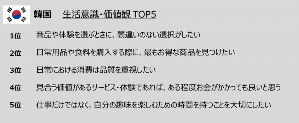 彼らの生活意識のトップ項目は、「商品や体験を選ぶときに、間違いのない選択がしたい」であり、これに続いて「日常用品や食料を購入する際に、最もお得な商品を見つけたい」というコストパフォーマンス重視の意識がランクインしています。クラスター分析の結果からも、どの国もTOP3にランクインしていないコスパ実利重視派が韓国では2位に位置しており、他国と対照的に消費における確実性と合理性が韓国人にとっての優先事項であることを示しています。