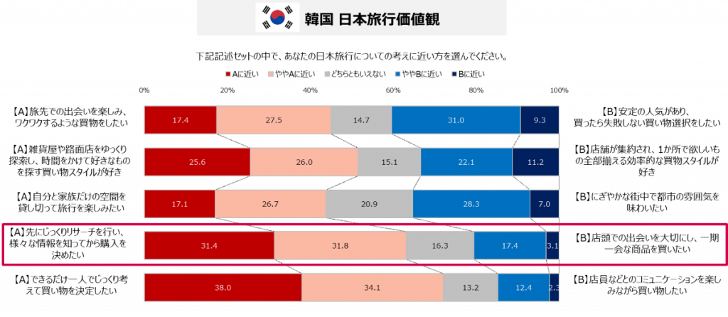 A) 事前リサーチの重視: 日本旅行中の買い物価値観として、韓国人観光客の買い物スタイルを分析すると、「徹底的な事前リサーチに基づいた計画消費」という特徴が顕著に現れています。調査では、「事前に情報を得てから購入を決めたい」層が63.2%(下図のAに近い、ややAに近いの合計)に達する一方で、「店頭での一期一会」を重視する層は20.5%(同じくBに近い、ややBに近いの合計)に留まりました。更に特筆すべきは、検討時期の早さです。旅行直前ではなく、「1週間以上~3ヶ月未満」から検討を始める層が約6割を占めており、「旅行に行くまで検討しない」層(8.9%)を大きく引き離しています。これらの結果から見える様に、韓国人訪日客の中では事前に計画を立てる層が依然として多数派です。