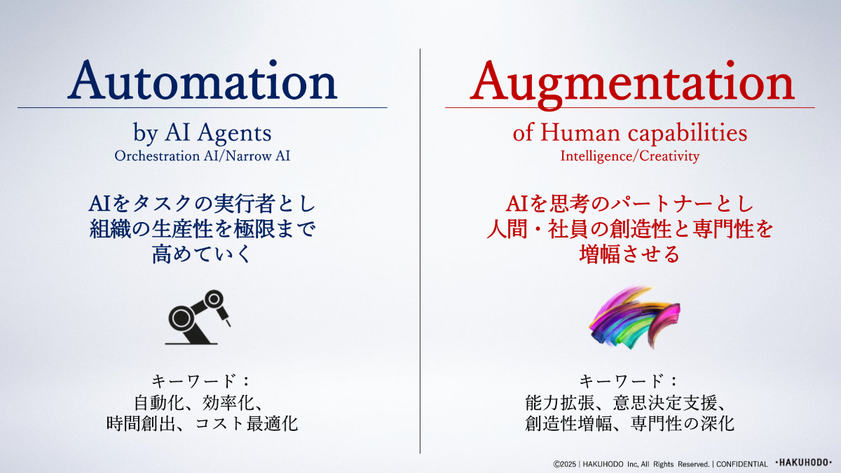 博報堂DYグループではHuman-Centered AIを指針に掲げ、AI活用の取り組みを加速させています。多くの企業がAIを導入するなかで、単なるAutomationだけを追求すれば、アウトプットは均質化してしまいます。博報堂では効率化は実施しつつも、その先にあるAugmantationにも重きを置いています。