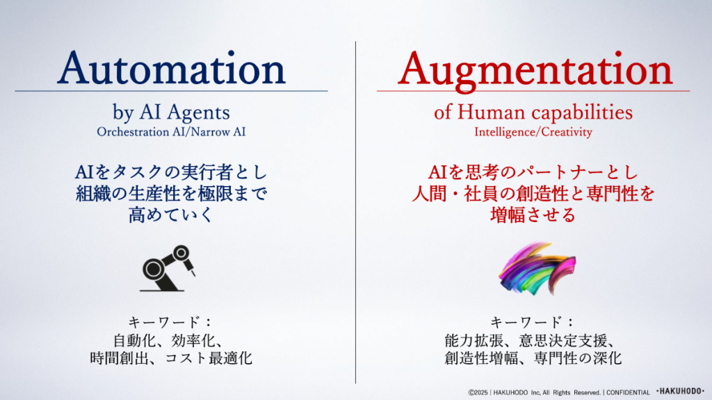 博報堂DYグループではHuman-Centered AIを指針に掲げ、AI活用の取り組みを加速させています。多くの企業がAIを導入するなかで、単なるAutomationだけを追求すれば、アウトプットは均質化してしまいます。博報堂では効率化は実施しつつも、その先にあるAugmantationにも重きを置いています。