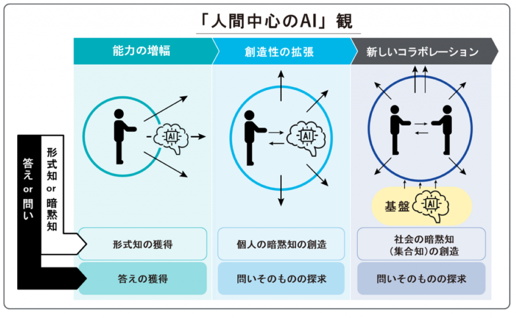 人間や組織の「生産性」「創造性」「能力」をいかに高めていくかが最も重要であり、それが我々の提唱する「人間中心のAI」の核となる考え方です。