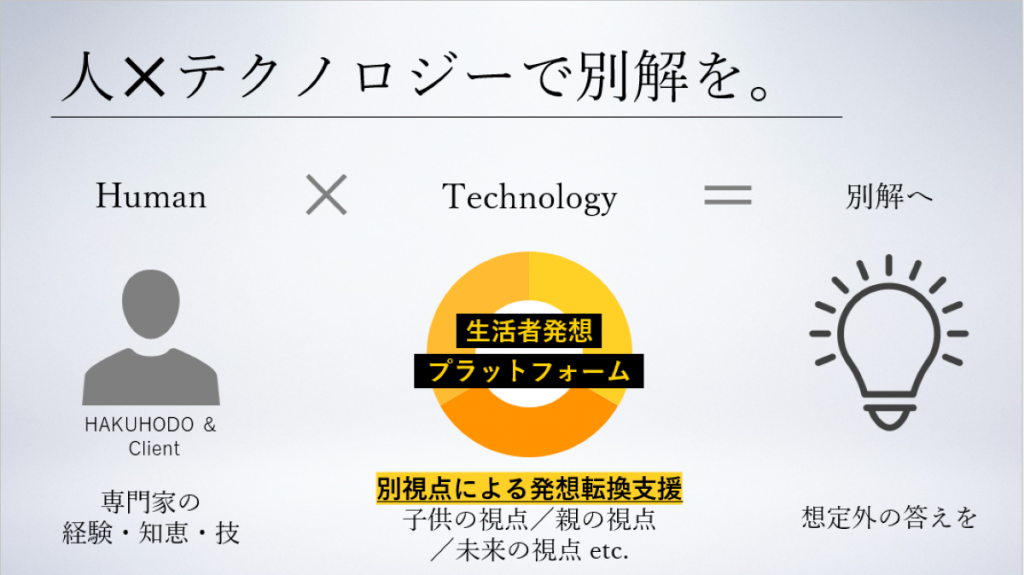 さらに、AIという自分とは違う存在を味方につけて、生活者の心を動かすアイデアを生み出すために、「新しい生活者発想プラットフォーム」を提供します。このプラットフォームは、人の知恵にテクノロジーを掛け算することで、同質化しないための“別解”を生むことを目指し、4つの機能を備えます。