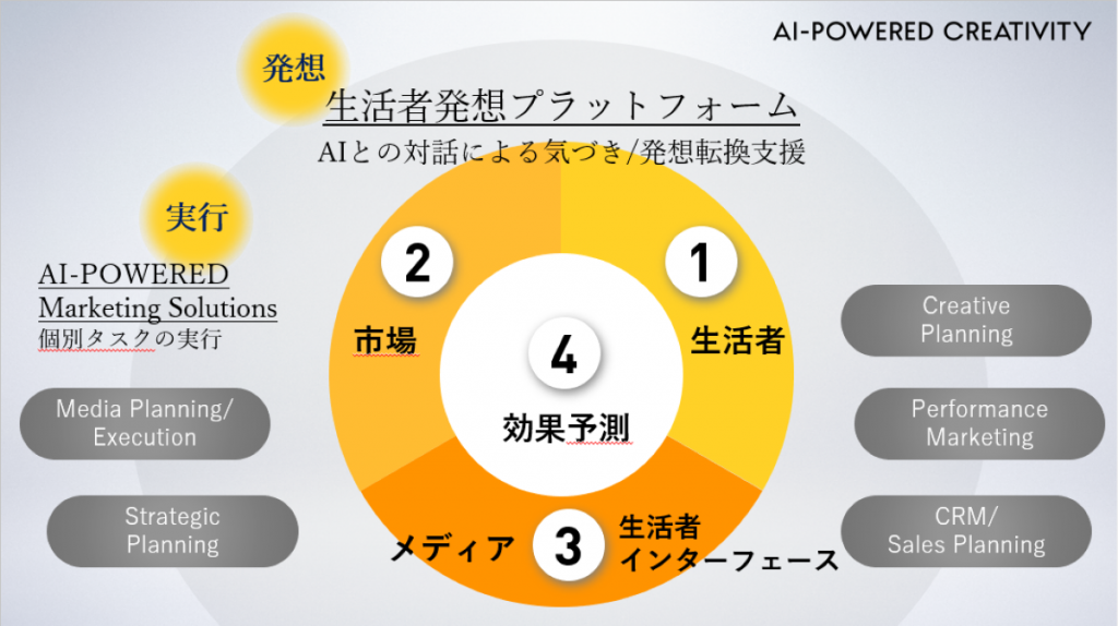 つまり、AIで人間の創造性を拡張する「AI-Powered Creativity」で、生活者に意味のある違いを提供し、同質化しない価値創造を行うことを目指しています。