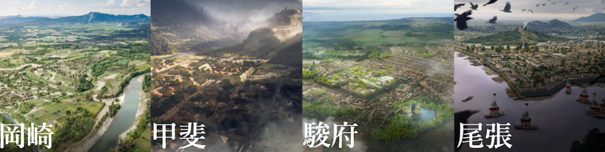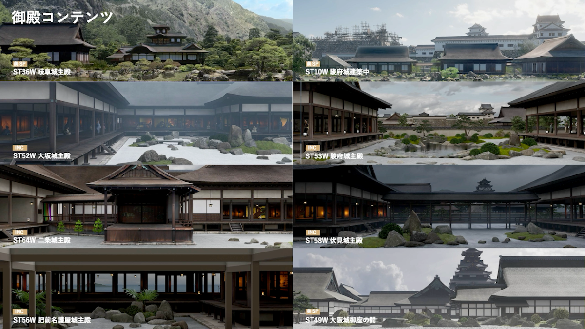 こうした表現を支えるのが、デジタルアセットです。LED背景として使う素材は、撮影の1年半~2年ほど前から準備を始めました。中世・戦国時代を表現するために全国の建造物や文化財を取材してリスト化し、フォトグラで取ってきてバーチャル空間上で集め、城下町・砦・城・御殿として構成します。 “実在”するものをベースにアセットを構築し、その前にセットを立てて芝居をする、そんな取り組みを進めました。