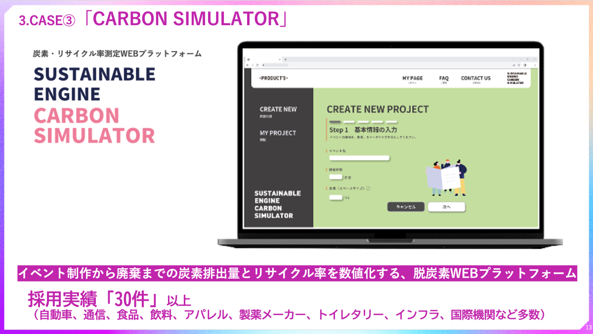 続いてご紹介する「カーボンシミュレーター」は、イベントの制作から廃棄までの炭素排出量とリサイクル率を数値化し、設計段階から推奨素材を選びながら制作プロセスに組み込める、脱炭素のためのWebプラットフォームです。採用実績は30件以上で、業界・業種をまたいで活用が広がっています。