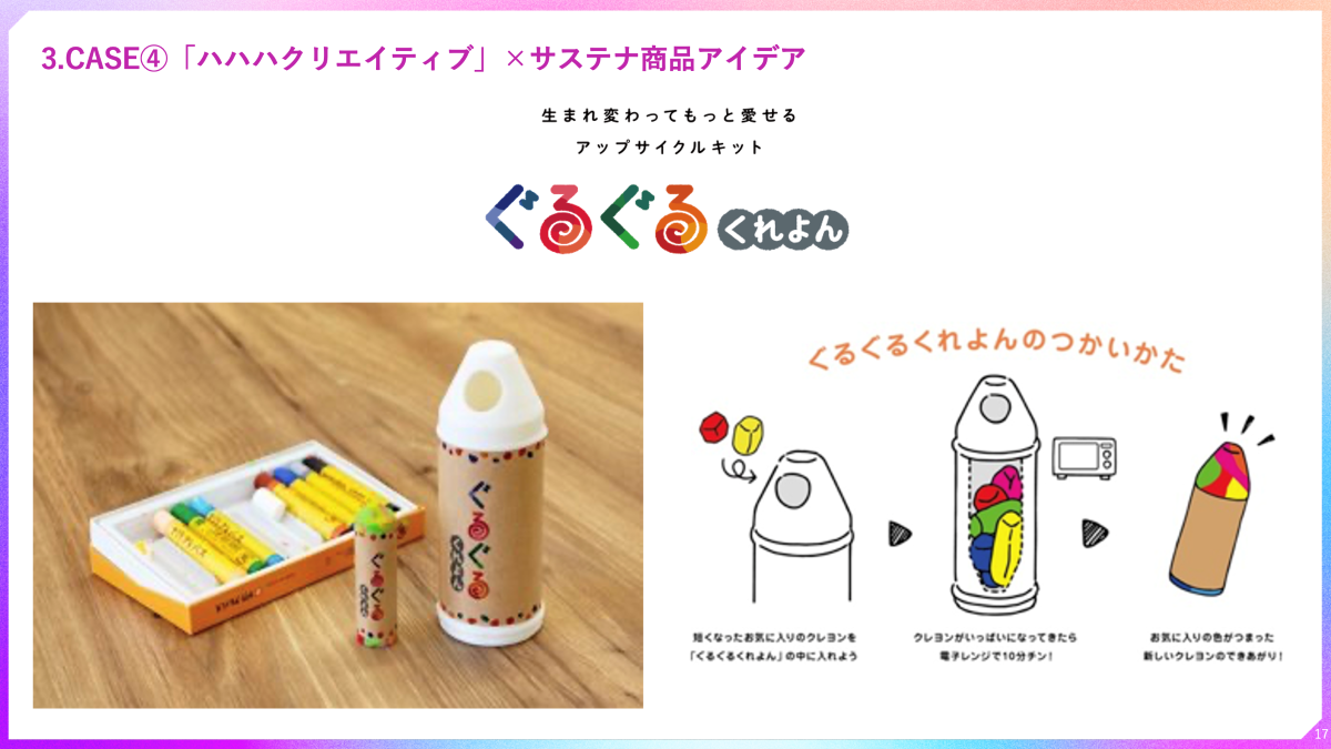 親子インサイトに着目するママクリエイターチーム「ハハハクリエイティブ」でも、サステナビリティに関する商品開発に取り組んでいます。ここでポイントとなるのは「我慢して捨てない」ではなく、「うれしい/楽しい体験として循環する」発想です。短くなったクレヨンを集めて、新しいクレヨンに生まれ変わらせる「ぐるぐるクレヨン」。サイズアウトした子ども服をぬいぐるみにして手渡せる「ZOOtto」。“もったいない”をワクワクに変え、商品のデザインや体験のあたたかみを大切にすることで、結果としてサステナビリティにつながります。