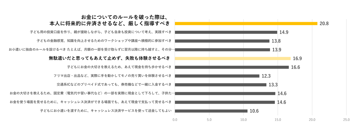 ところで、「金融教育の工夫」の中で最も高いスコアだったのは「お金についてのルールを破った際は、本人に将来的に弁済させるなど、厳しく指導すべき」(20.8%)であり、その次は「あえて失敗も体験させるべき」(16.9%)でした。