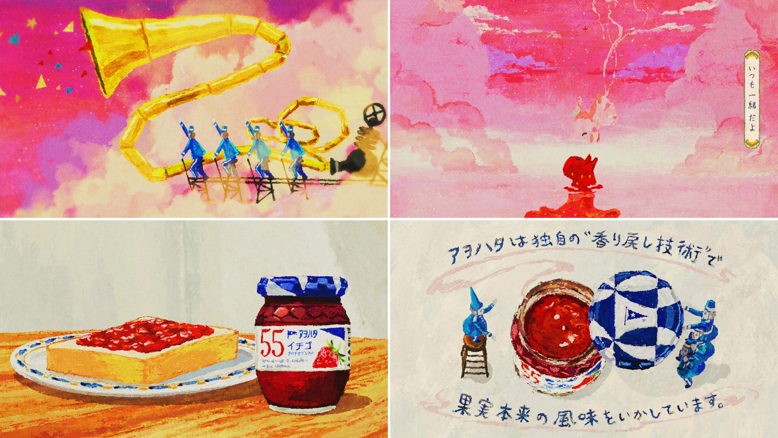 ジャムづくりへのこだわりのうち、おいしさのポイント となる “ 香り ” にフォーカスし、イチゴちゃんとカオリちゃんというキ ャラクターを主役に、思わず覗いてみたくなるようなストーリーに仕立てました。アニメーションと歌でジャムづくりの世界を優しく、彩りのある世界観で表現しています。