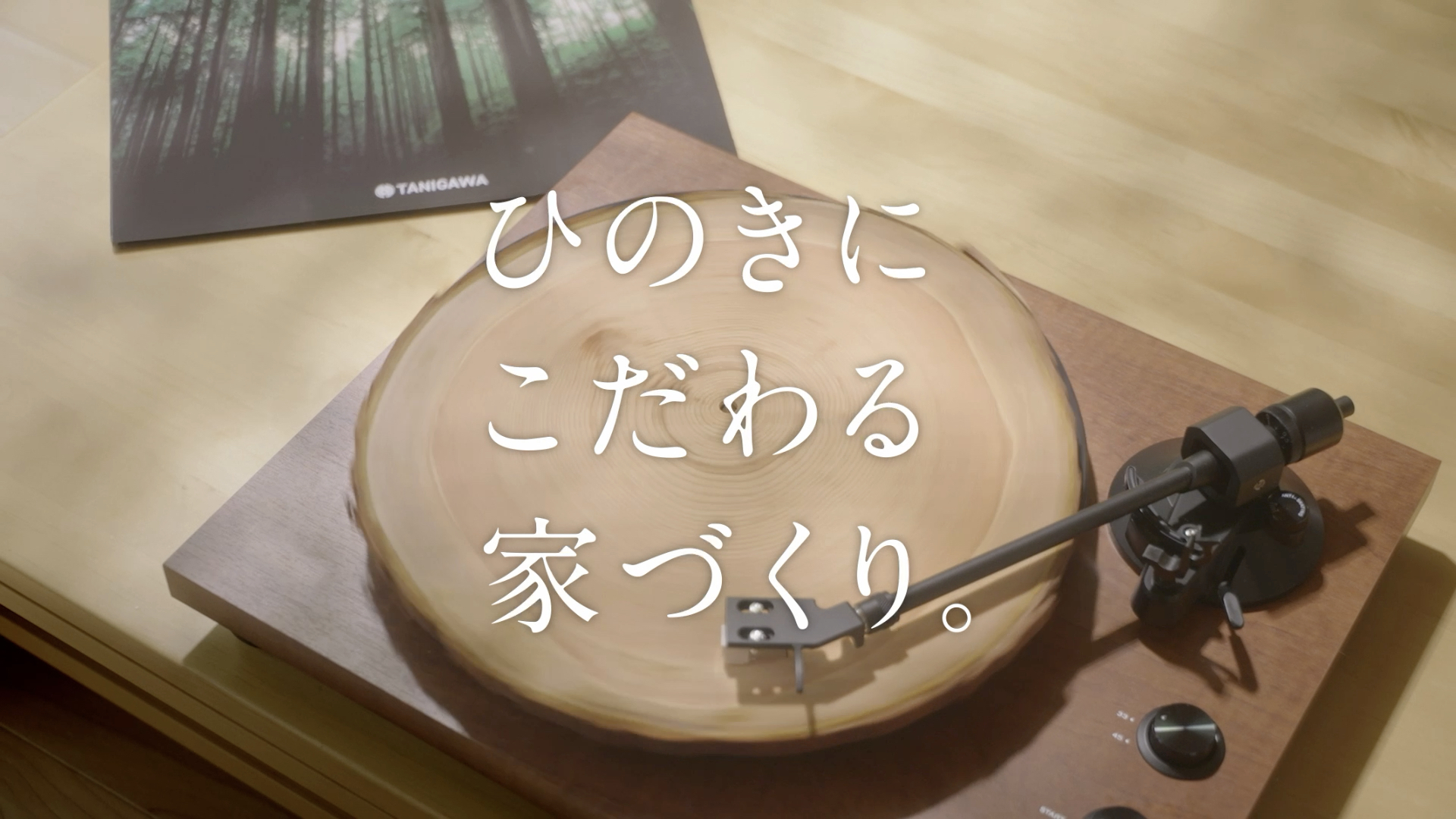 谷川建設が実際に使用している木曽檜は、樹齢80年以上で年輪が詰まった木曽檜だけ。そしてその年輪がつまった断面がレコードっぽいと思い「ひのきレコード」の企画ができました。ひのきがレコード盤となり回転して、そこから聴き馴染みのあるサウンドロゴが流れてくるだけのシンプルな企画です。制作の過程で、カットを割ったり、セリフを入れたり、コピーを変えたり、いろんな足し引きも検証しましたが、最終的にはワンカットでセリフも落としてシンプルにすることで、サウンドロゴのインパクトも大きくなるとわかり、今の形に落ち着きました。木曽檜というひのきを使っていること、法隆寺と同じひのきを使っていること、木曽檜の中でも樹齢80年以上にこだわってるということなどなど…本当は伝えたいことがたくさんあったのですが、ひとつに絞ってよかったです。制作過程を通して、情報を削ぎ落とすことの大切さを改めて実感できた仕事でした。