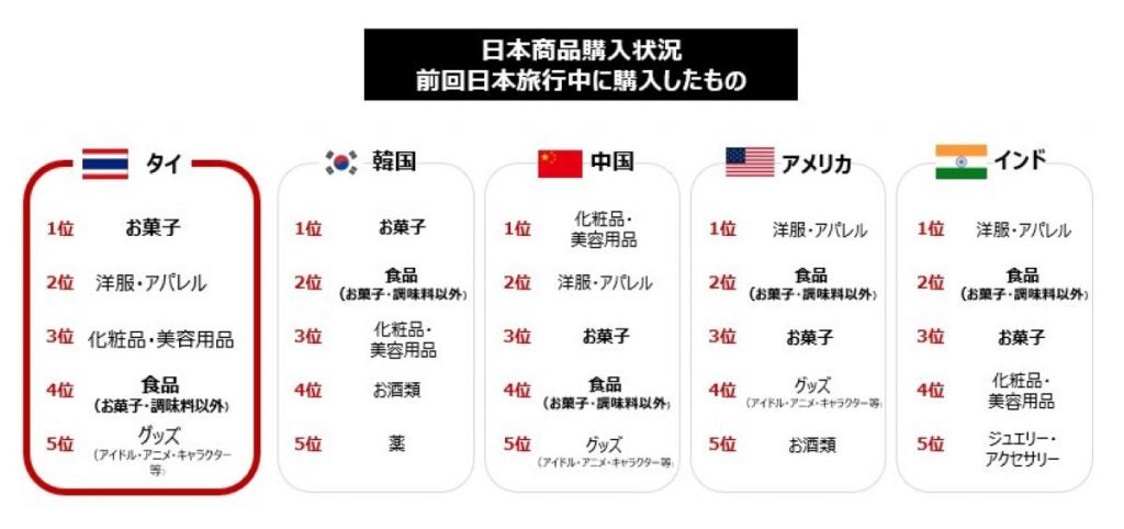 調査結果から見ると、タイの購入品目第1位は「お菓子」、第2位は「洋服・アパレル」となっており、タイ人の嗜好が強く反映された結果となっています。タイ人は昔から日本のお菓子に馴染みがあり、味も好みで、自分で消費するのもお土産として購入するのも満足度が高く、訪日するのであれば必ずお菓子を購入するという消費行動が固定化しました。