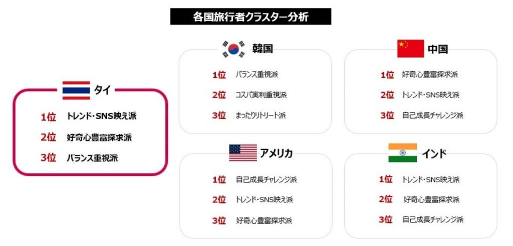 本調査において、各国の訪日客を7つのクラスターに分類した結果、タイ人訪日客の最大の特徴は「トレンド・SNS映え派」が第1位(46%)を圧倒的に占めたことです。これは調査対象5か国の中で最も高い割合であり、タイ人の旅行スタイルを象徴的に示しています。
