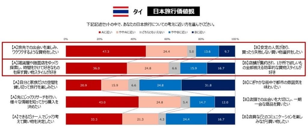 さらに、日本旅行における価値観を見ると、タイ人訪日客の71.7%が「旅先での出会いを楽しみ、ワクワクするような買物をしたい」を選択し(Aに近い47.3%+ややAに近い24.4%)、これは調査対象国の中で最も高い数値です。また、「雑貨屋や路面店をゆっくり探索し、時間をかけて好きなものを探す買い物スタイルが好き」も60.8%(Aに近い36.0%+ややAに近い24.8%)と高く、探索的な旅行・買い物スタイルが目立ちます。