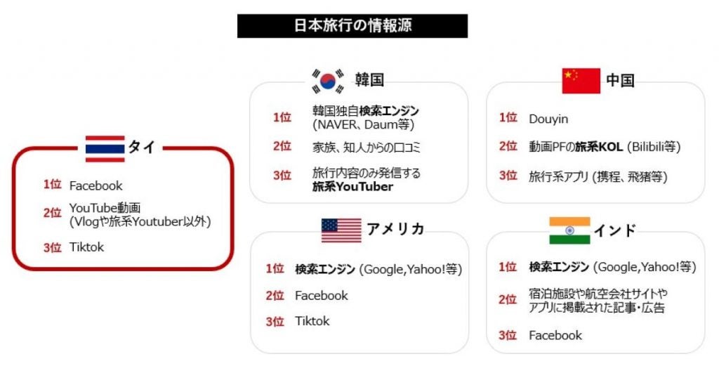 また、日本旅行の情報源として、タイ人は今でもFacebookを最も利用していると回答し、他の調査対象国と比べてもSNSによる影響が依然として高いことがわかります。