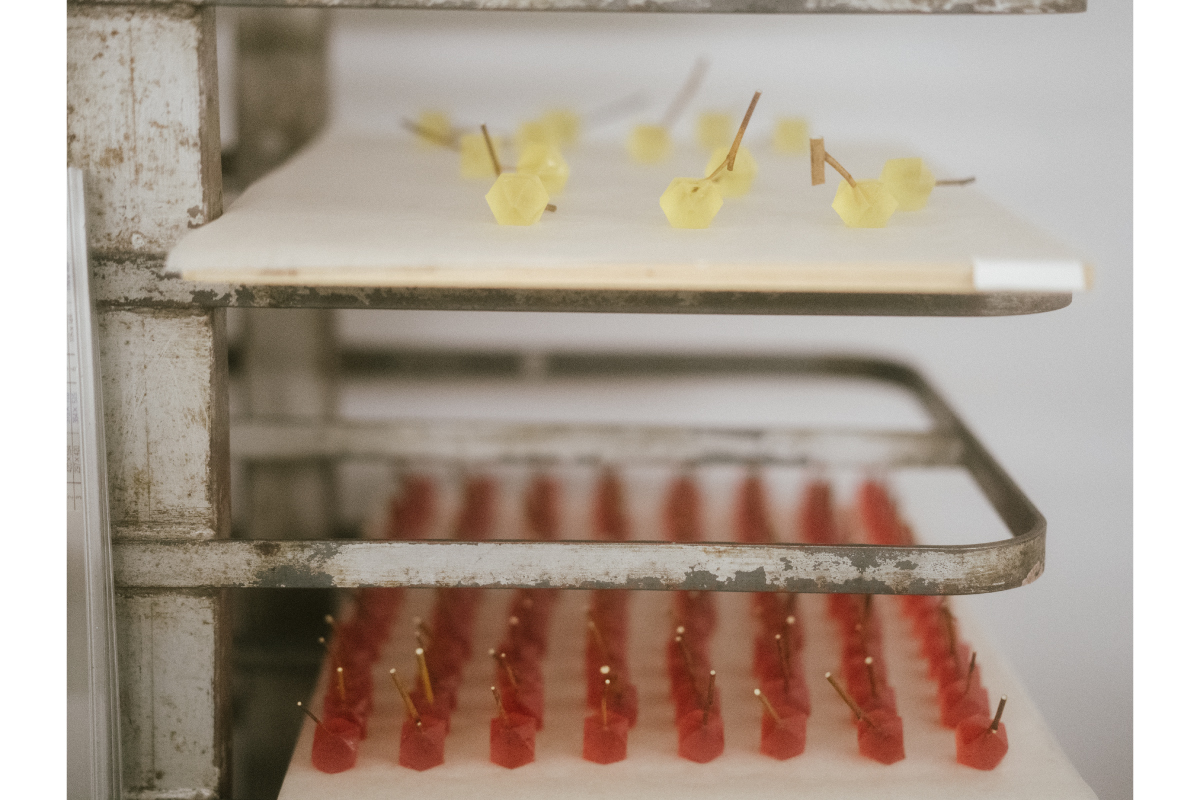 最初は実際の木の枝に餡入りのお団子をつけてみたのですが、それだと重力に負けて落ちてしまう。これは、“なっていない”状態です。ところが、試行錯誤の中で琥珀糖を使ったところ、うまくいきました。琥珀糖って最初は寒天で、周りが結晶化することで琥珀糖になるのですが、それがしっかりと枝を抱え込むように接着したんです。