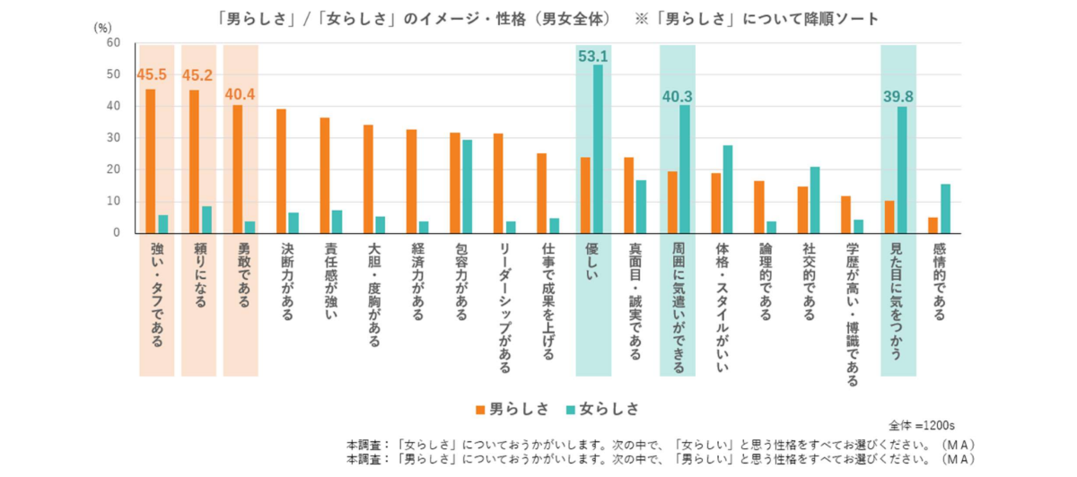 一つ目は「男性らしさ」「女性らしさ」について。「男らしさ、女らしさに関して、それに近いと思う性格を答えてください」という質問には、男らしさについては「強い」「タフである」「頼りになる」などのイメージが上位に挙がりました。女性らしさでは「優しい」「周囲に気遣いができる」「見た目に気を遣う」などが高く、男女ともに年齢が上がるほど、特に60代でこれらのイメージが高い傾向がみられました。