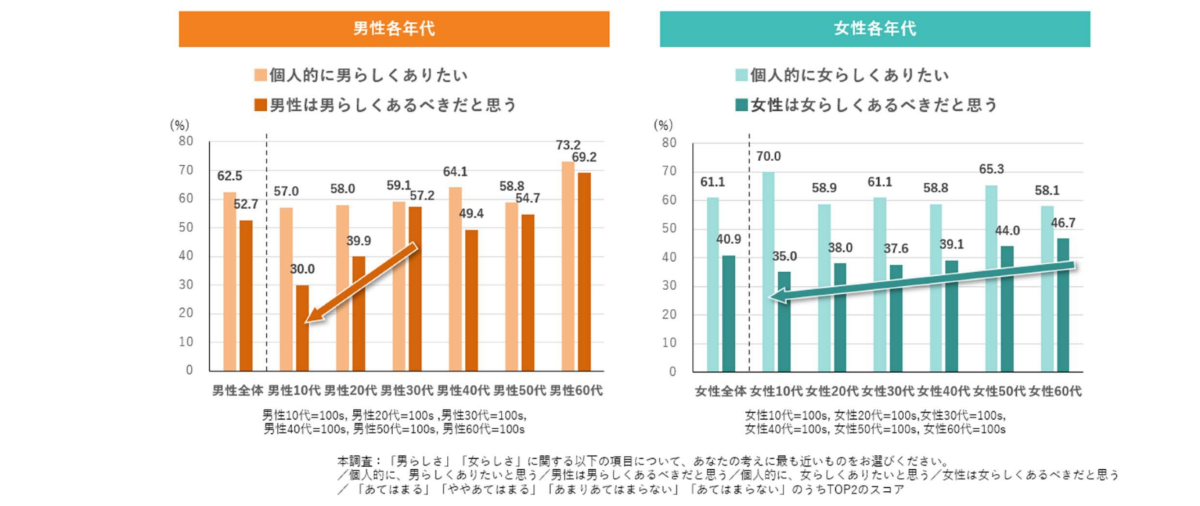 一方、若い世代はあまり囚われていないようで、男性60代では約7割が男らしくあるべきだと回答しているのに対して、男性10代は3割に留まりました。年齢が上がるにつれ性別役割の意識が強く、男性・女性にこうあってほしいというイメージを押し付けてしまっていると改めて感じました。
